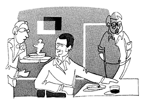 Inork igerri ezteko modura, makurka-makurka, gallegu itxurako gizontxo bat etorri jakon orduan alboko mahai batetik, irribarrezka, bere ondora Manuri.